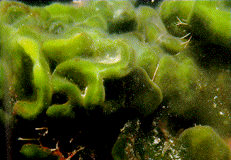A large, rope-like, branched, dark green algae. Texture