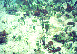 The lagoon, lying mostly to the northwest of the islands is relatively shallow, the greater part of it lying at depths between 8 and 18m. Lithified Pleistocene calcarenite deposits submerged beneath the lagoon provide a relict topography which seems to be a dominant factor controlling the broad features of lagoonal bathymetry. For instance: (1) North Rock is an exposed remanent of a Pleistocene aeolianite which presumably extends along the line of the Ledge Flats reefs; (2) Many of the reefs (Three Hills Shoals, Baileys Bay Flats) lie on crescent lineations reminiscent of the aeolianite hills of Bermuda itself; (3) Aeolianite has been reported as the base for the south shore boilers.