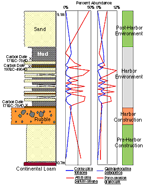 Stratigraphic section from the ancient harbor entrance showing four dominant foraminifera species that alternate in abundance in relation to the sediment type.