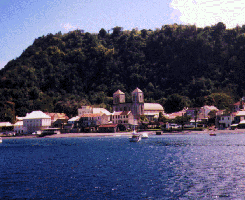 This is a view of the Cathedral from a ship in the harbour. The Cathedral was the one building in St. Pierre that only suffered minor damage from the 1902 eruptions. It is located several kilometres away from the other structures that received the most damage. The path of the block and ash flow was diverted down through the valley of the Riviere Blanche, which is in the opposite direction of the Cathedral.