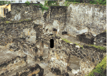 The prison was built in a slight depression in between the town hall and theatre. The cells, corridors, and yards were confined on either side by the high walls of the two buildings. This picture shows that the walls were somewhat protected from the ash avalanche and suffered less damage then the other surrounding structures.