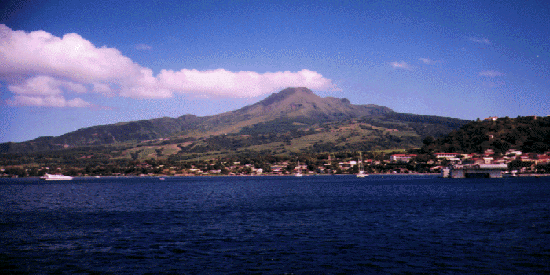 The city of St. Pierre, destroyed by the catastrophic eruption in 1902, is in the northwest part of Martinique, slightly southwest of Mont Pelee. This is a view from the harbour of St. Pierre with Mont Pelee in the background, as seen today. The city has regenerated to a population of 5000. The lush vegetation has grown back on Mont Pelee since the eruptions in 1902.