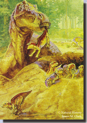 It is an understatement to say that parenthood must have been a challenge for the Maiasaur. To attain a length of 1 meter in 60 days, each hatchling would require about 1.2 kilograms of plant food per day. A litter of 20 would need 24 kilograms of berries, seeds, and green leaves per day. Based on these quantities, it would have been necessary for both parents to forage and feed the young. The parents would have to grind up the food and carry it to the nest within their bodies, depositing it near the hatchlings as a partially digested slurry, either by regurgitation or by elimination. |