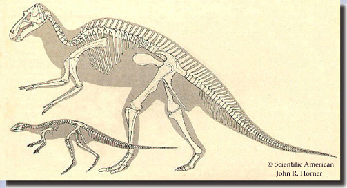 In what could be best described as a bone bed, a herd was overwhelmed in a sudden heavy fall of volcanic ash. The herd was composed of animals whose body length fell into either 3, 4, 5, or 7 meter category. An explanation for this phenomenon is that the animals reproduced once every year and that the young traveled with the colony. The size groups corresponded to age groups of 1, 2, 3, or 4 (and over) years. Maiasaurs would therefore have matured in 4 years and then ceased to grow. |