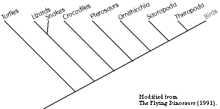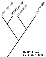 The first Pterosaurs appear suddenly on the scene during the Late Triassic. These Rhamphorhynchoids are fully developed with a fully modified skeleton for flight. An intermediate stage between terrestrial reptile and Pterosaur has yet been found. It is highly unlikely that the "missing link" will ever be found (if one ever existed). |