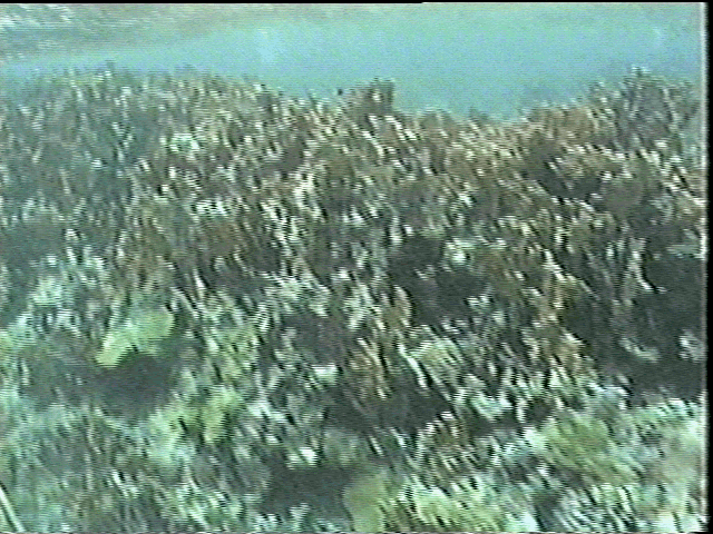 On peut facilement remarquer, parmi les récifs, que le corail Acropora, maintenant mort, se fait remplacer par le corail Millepora. Cette image représente une dense poussée de millepora par dessus l'acropora mort qu'on ne peut presque plus voir.