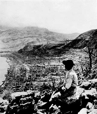 Le 20 mai, une éruption plus intense que celle du 8 mai s'est produite et a complètement détruit ce qui restait de St. Pierre. Le volcanisme persista pendant les mois de mai et juin. Cette photo fut prise au mois de juillet (1902) quand des gens sont venus évaluer l'importance des domages ainsi que le potentiel de récurrence du volcan.