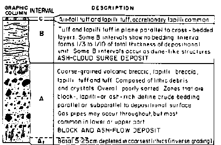 Une étude des dépôts volcaniques a permis d'identifier une coulée de blocs et de cendres ainsi qu'un nuage de cendres. Les dépôts contenaient des brèches volcaniques grenues, des débris et des cristaux. Cette masse s'est écoulée au travers de la vallée de la rivière Blanche au sud-ouest du mont Pelée jusqu'à la mer des Caraïbes. Le nuage de cendres, environ 100 m au-dessus de la coulée, comprenait une fine couche grenue de lapilli..